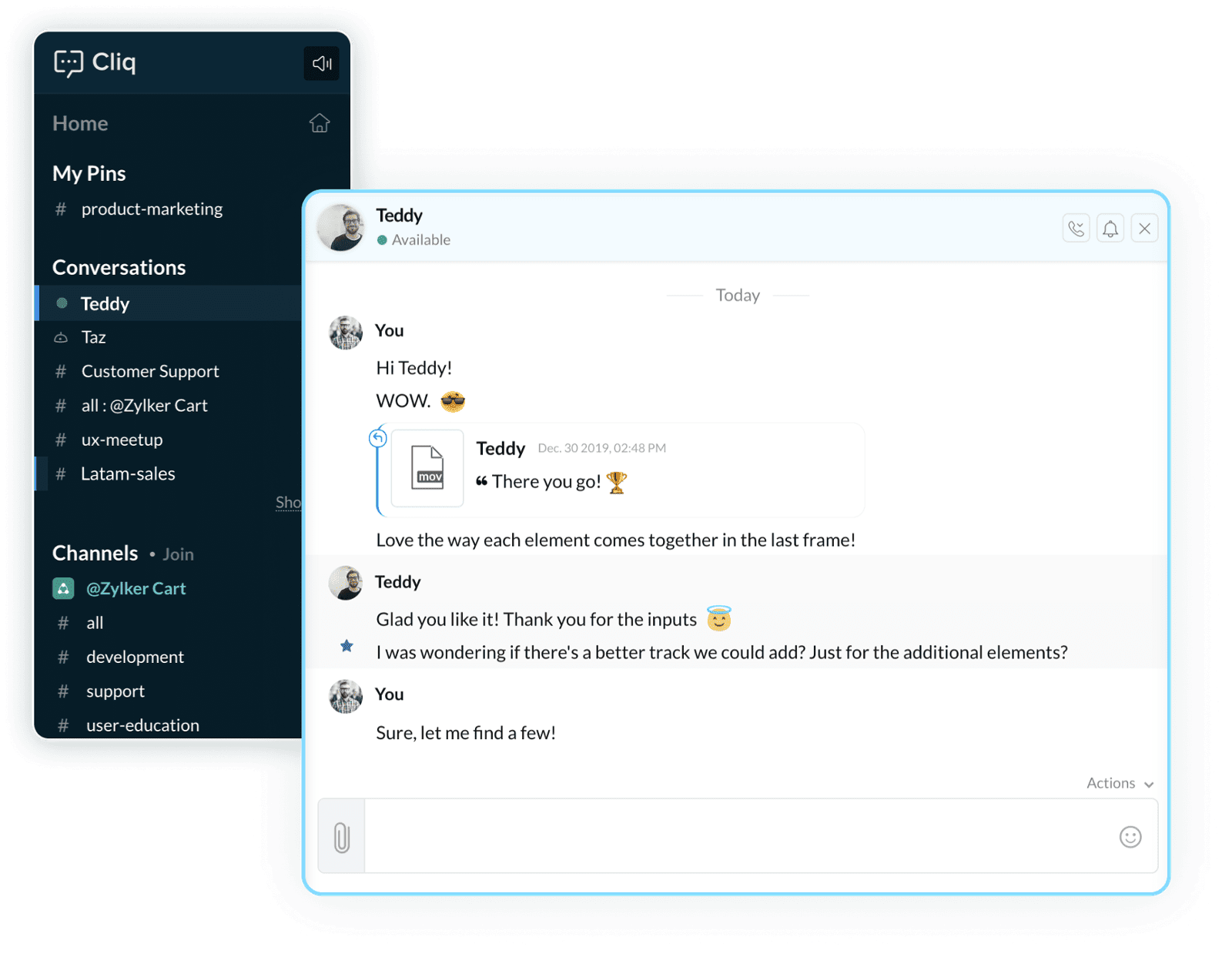Zespoły potrzebują elastycznych narzędzi komunikacji, aby skutecznie współpracować. Zoho One oferuje Cliq, usługę przesyłania wiadomości, która zapewnia: