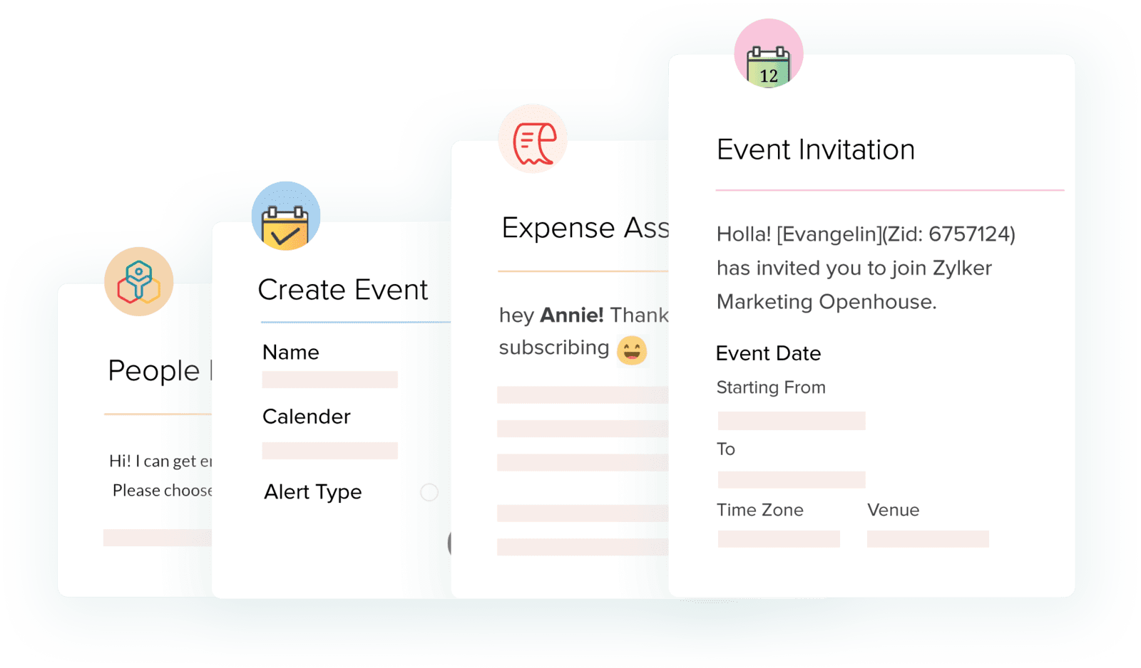 Twórz boty zatwierdzające , planuj wydarzenia , wysyłaj przypomnienia o wydarzeniach i nie tylko za pomocą chatbotów i Zia - twojej asystentki AI . Automatyzuj rutynowe zadania i informuj pracowników, kiedy zwiększyć produktywność. Wysoka personalizacja gwarantuje, że stworzysz własne przepływy pracy, które łączą ATS i HRMS lub ścieżki śledzenia wydajności połączone z arkuszami czasu pracy. Skarbnica funkcji Zoho People, pomoże Ci w podjmowaniu właściwych decyzji biznesowych dzięki dogłębnej, automatycznej analizie danych.